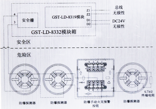 GST-LD-8332編址接口模塊(以下簡稱編址接口模塊)可與防爆設(shè)備(防爆感溫、感煙、煙溫復(fù)合探測器、防爆手動報警按鈕等)配接,組成本安型防爆系統(tǒng)。一旦發(fā)生火災(zāi),編址接口模塊將報警信號通過總線傳入火災(zāi)報警控制器(以下簡稱控制器),控制器產(chǎn)生報警信號并顯示出編址接口模塊的報警地址信息。當(dāng)編址接口模塊本身出現(xiàn)故障時,控制器將產(chǎn)生故障信號并顯示編址接口模塊故障地址信息。