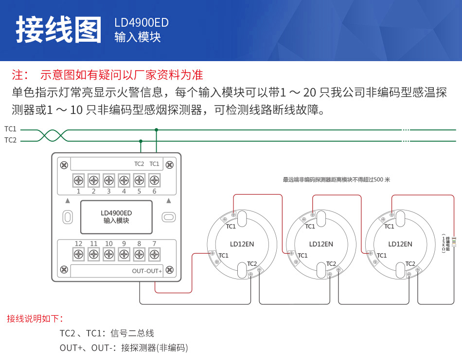 4、每個(gè)LD4900ED輸入模塊可以帶1~20只利達(dá)公司非編碼型探測(cè)器。