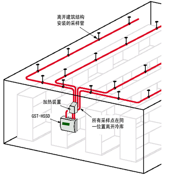 本指南用于幫助設計者針對冷庫這種特殊的環境條件設計有效和可靠的煙霧探測系統。我們總是敦促設計者使其設計的空氣采樣式煙霧探測系統達到或超過消防規范、標準或規則的規定,但在這一應用中,要做到這一點相當困難。當設計不能滿足一般公認的參數指標時,設計者應該與用戶、保險公司或權威機構針對其中的難點進行討論。以下吸氣式感煙火災探測器以GST-HSSD(編輯注:此型號目前已經停產,實際可用其他型號替代)為例。
