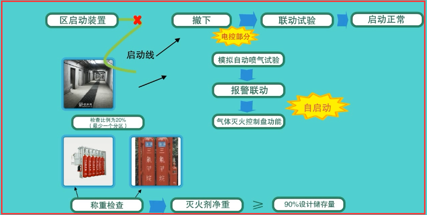 2、對每個防護區進行一次模擬自動噴氣試驗。通過報警聯動,檢驗氣體滅火控制盤功能,并進行自動啟動方式模擬噴氣試驗,檢查比例為20%(少一個分區)。