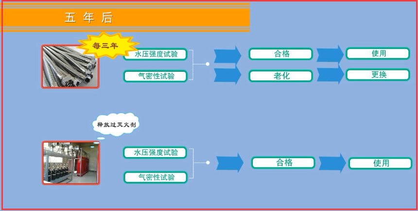 2、五年后,對釋放過滅火劑的儲瓶、相關閥門等部件進行一次水壓強度和氣體密封性試驗,試驗合格方可繼續使用。