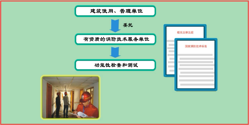 年度檢測是建筑使用、管理單位按照相關法律法規和消防技術標準,每年度開展的定期功能性檢查和測試;建筑使用、管理單位的年度檢測可以委托具有資質的消防技術服務單位實施。年度檢測內容和要求見本章第四節“系統的檢測與驗收”中“系統檢測”的內容。