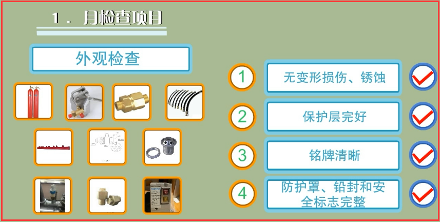 ①滅火劑儲存容器及容器閥、單向閥、連接管、集流管、安全泄放裝置、選擇閥、閥驅動裝置、噴嘴、信號反饋裝置、檢漏裝置、減壓裝置等全部系統組件應無碰撞變形及其他機械性損傷,表面應無銹蝕,保護涂層應完好,銘牌和保護對象標志牌應清晰,手動操作裝置的防護罩、鉛封和安全標志應完整;