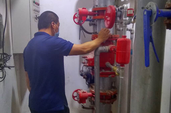 三、檢查消防供水設施:消防水池外觀,消防水箱外觀,消防水泵及控制柜工作狀態,穩壓泵、增壓泵、氣壓水罐工作狀態,水泵結合器外觀、標識,管網控制閥門啟閉狀態,泵房工作環境。