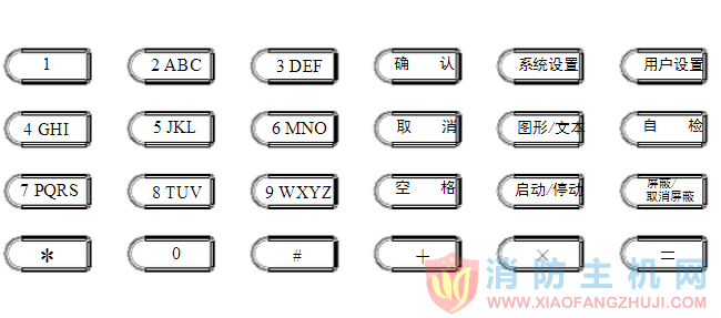 指用戶操作控制器時,完成相應的命令,改變系統(tǒng)狀態(tài)的按鍵,包 括:“火警確認”、“消音”、“警報器消音/啟動”、“火警傳輸直接控制”、“復位”、“自檢”、“啟動/停動”、“屏蔽/取消屏蔽”。  ? 設置功能類按鍵:指用戶需要設置控制器的參數(shù)、調(diào)試及改變控制器設置時使用的按 鍵,包括:“系統(tǒng)設置”、“用戶設置”。