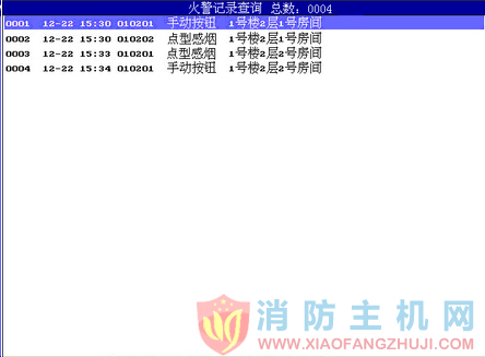 1.2.3 火警記錄查詢  進入“2、火警記錄查詢”,可檢查火警記錄信息,如圖1-6所示。每條信息包括序號、火警發(fā)生的時間、二次碼、設備類型及注釋信息。本控制器可查詢系統(tǒng)新發(fā)生的1000條火警記錄信息